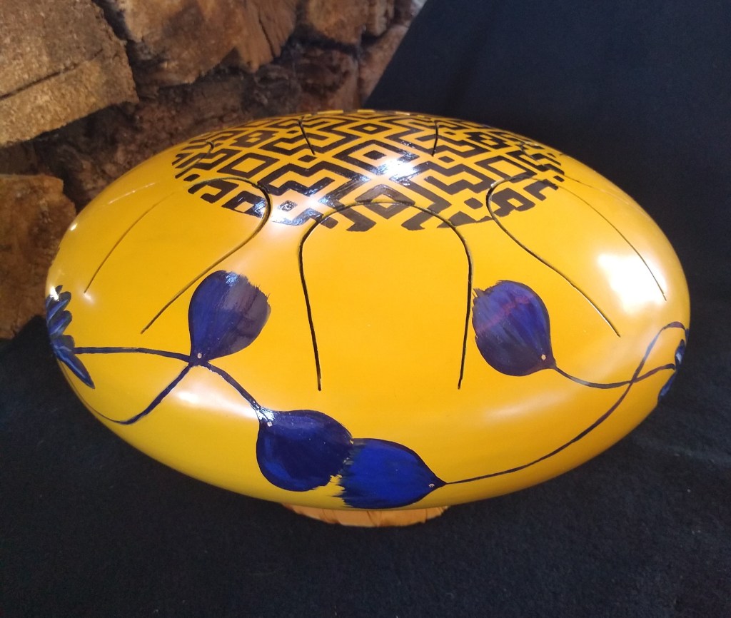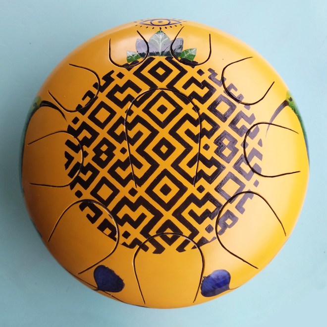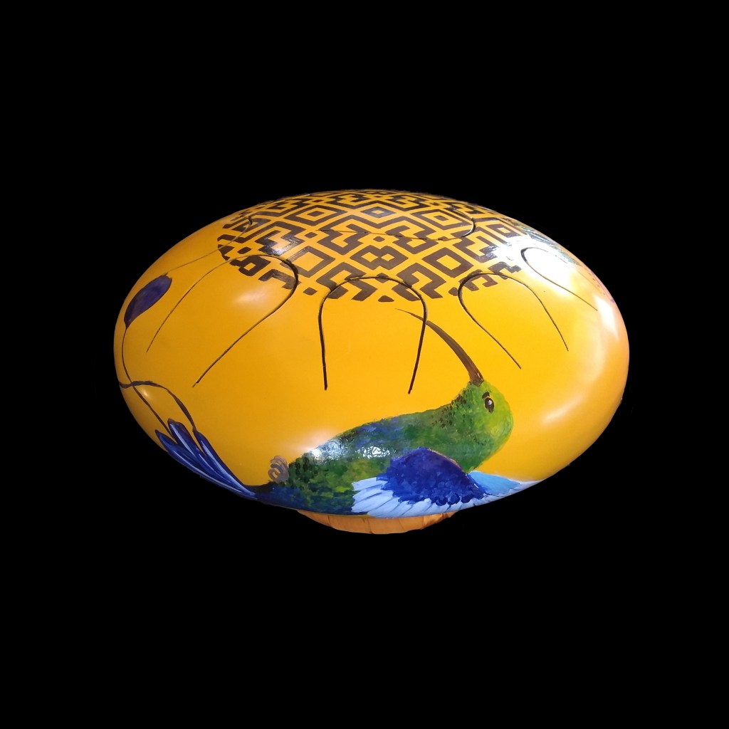 Hank drum à destination du Pérou, motif ancestral du peuple Shipibo, feuille de Noya Rao, plante Maîtresse, entouré de deux colibris.