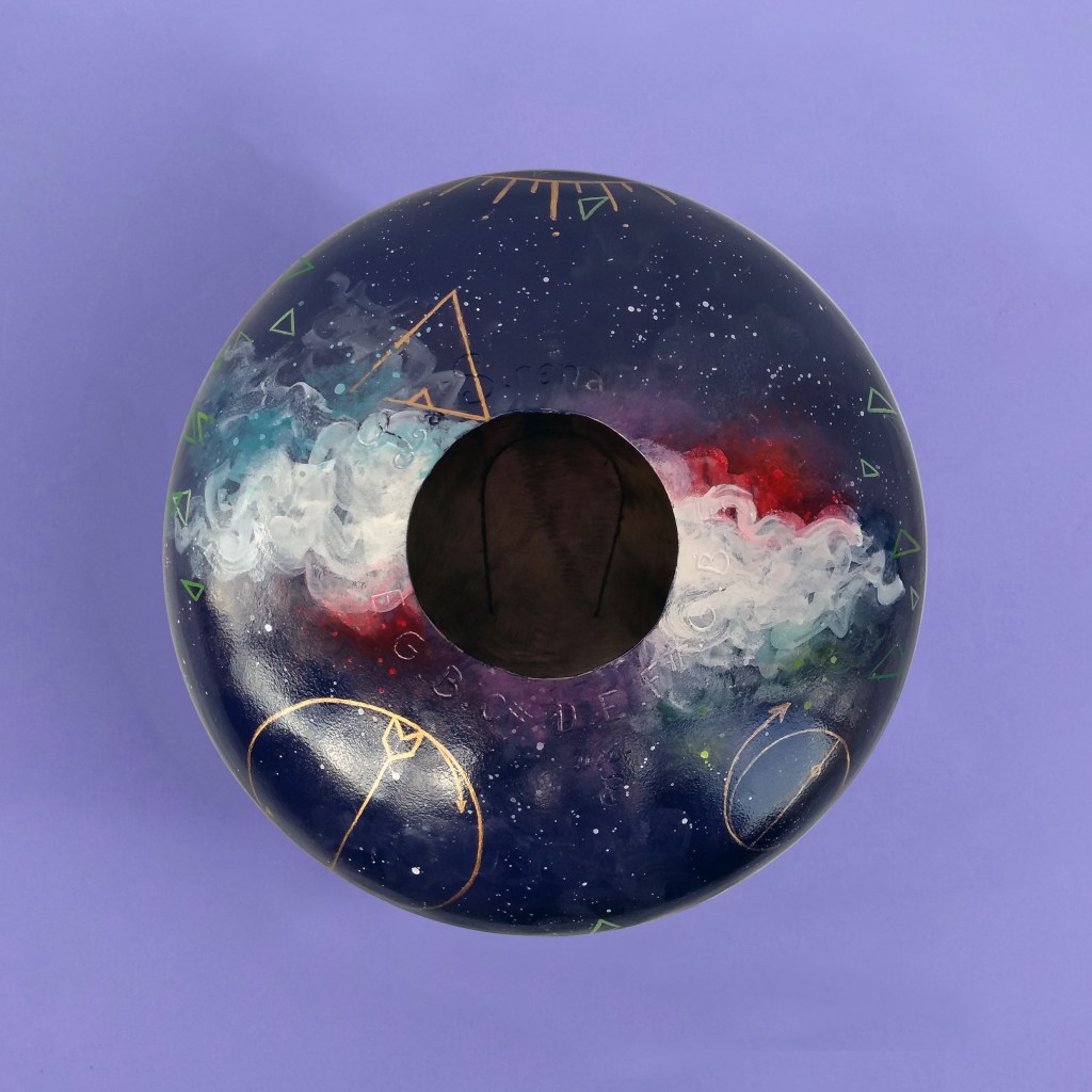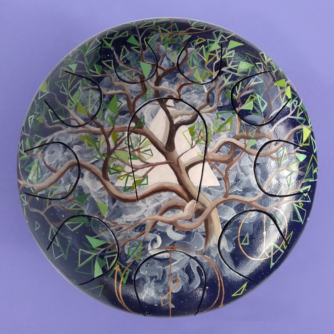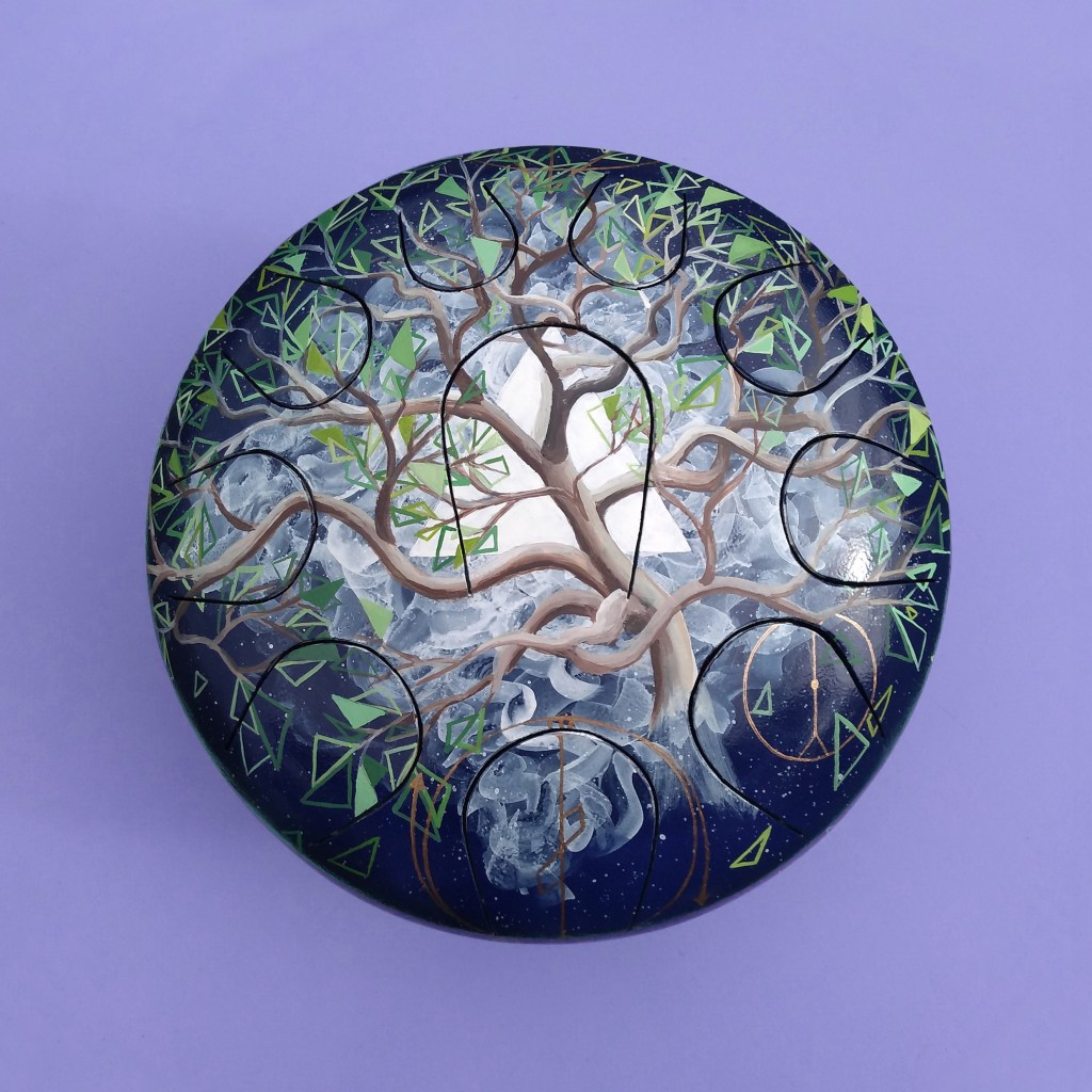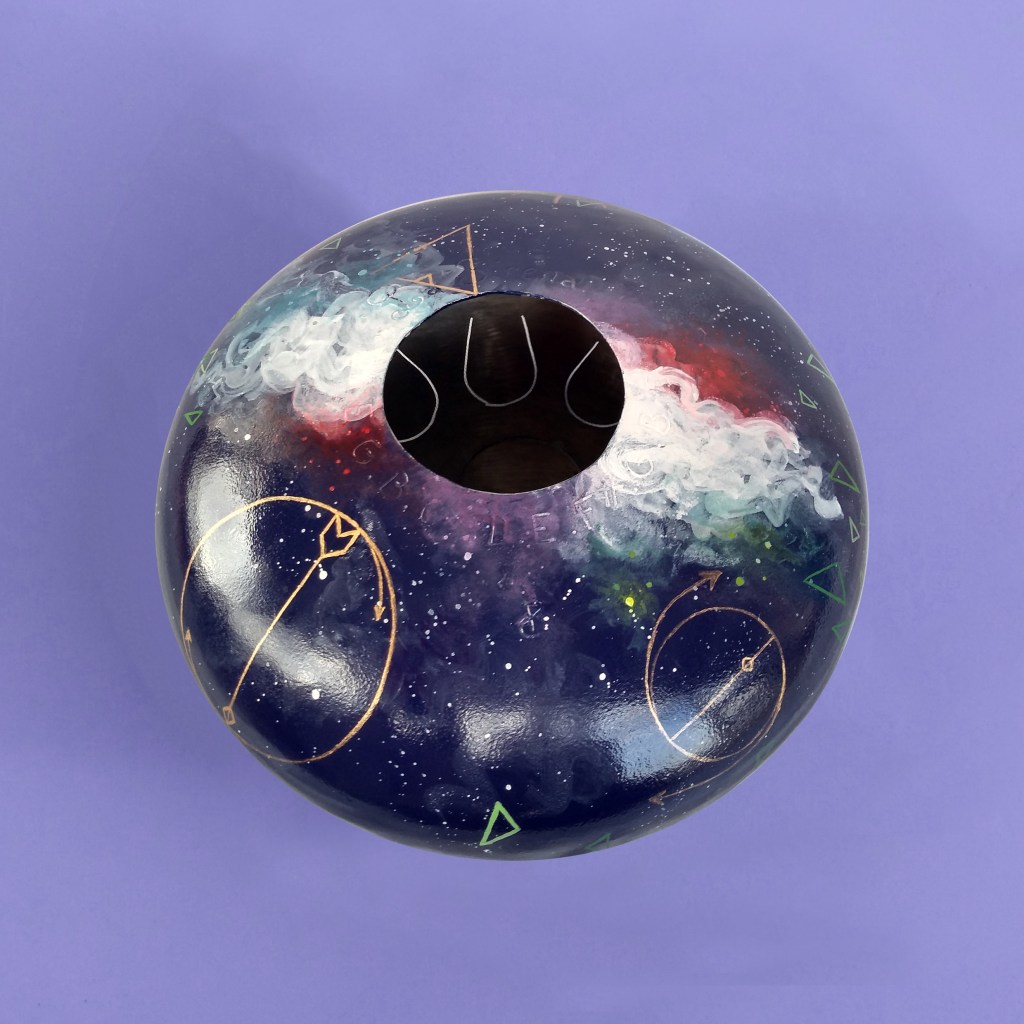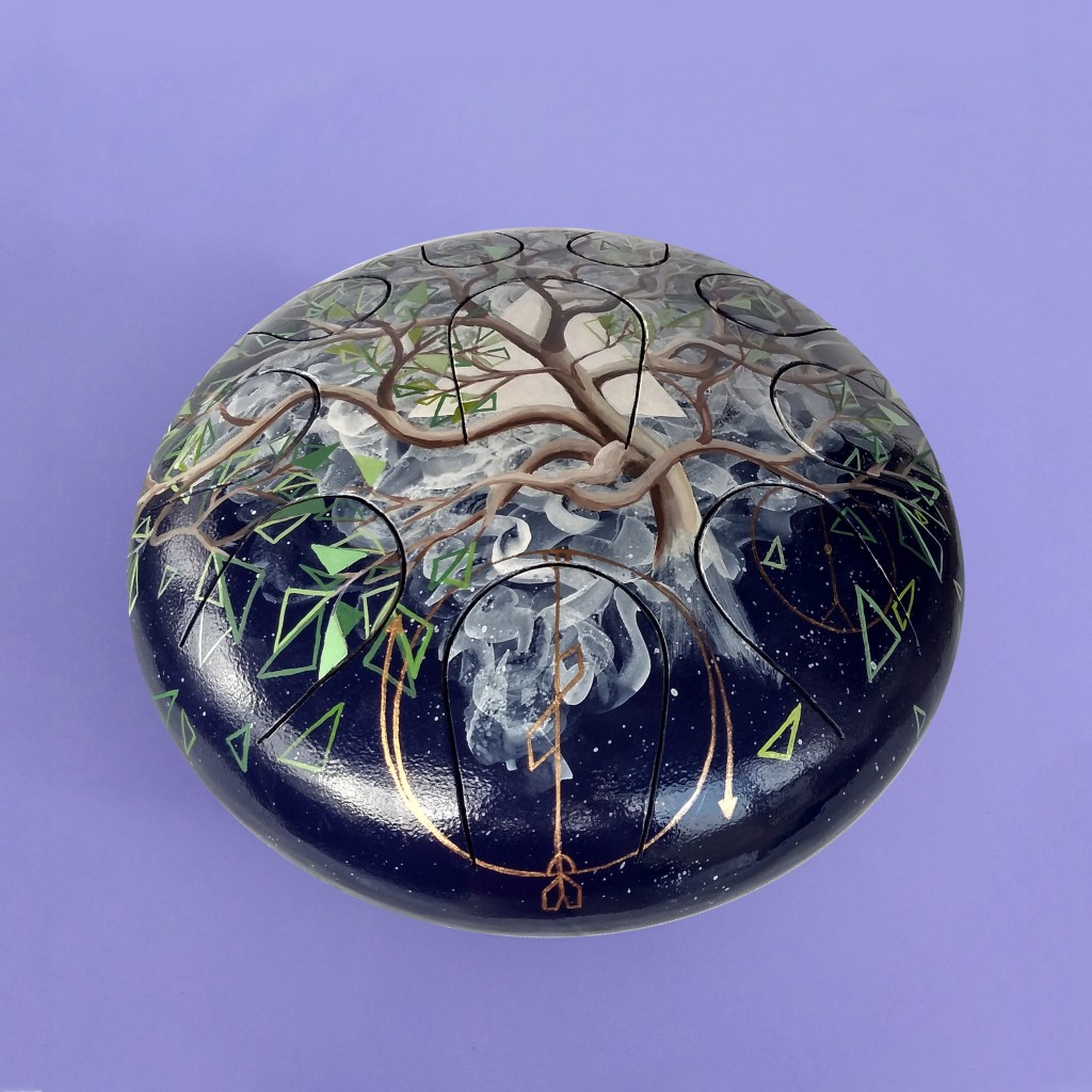 Hank drum à destination des Etats Unis, motif arbre du cosmos voyageant à l’infini et au delà…