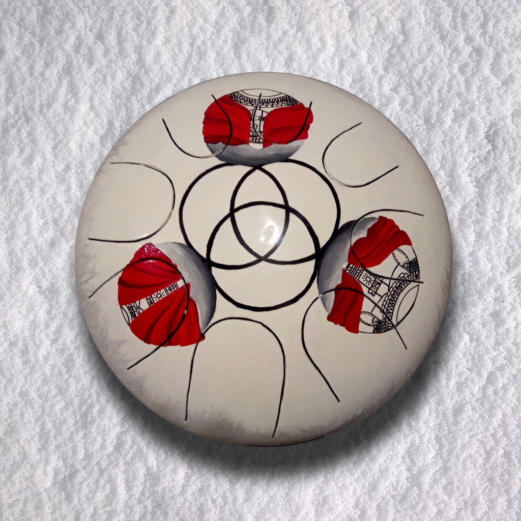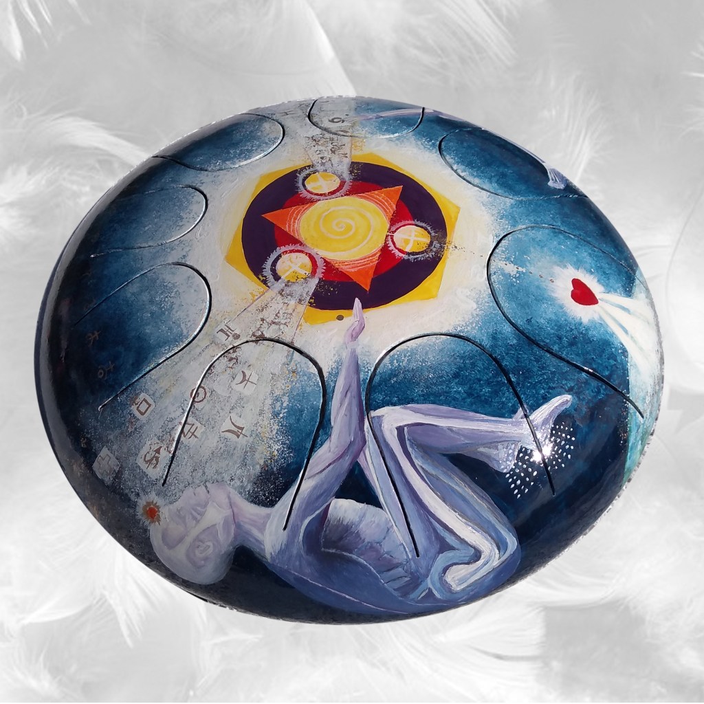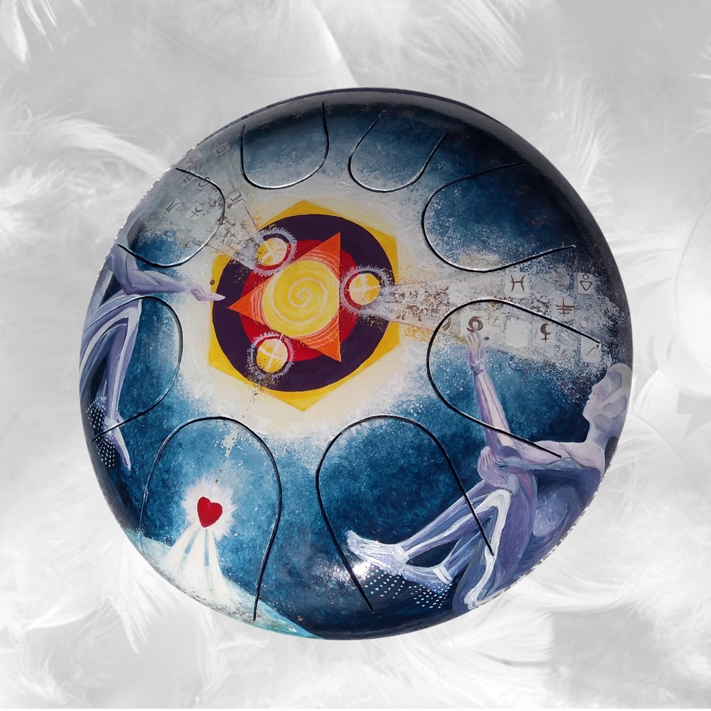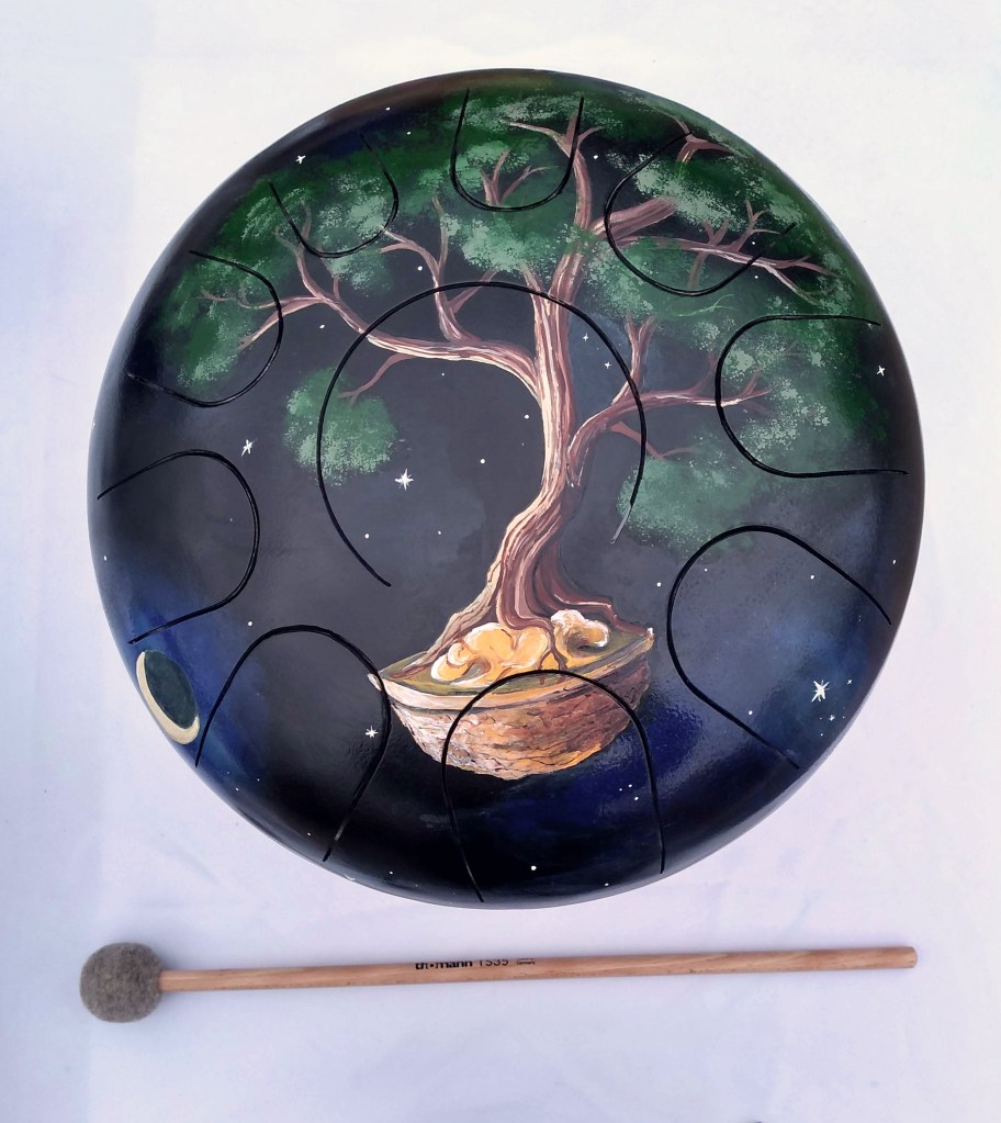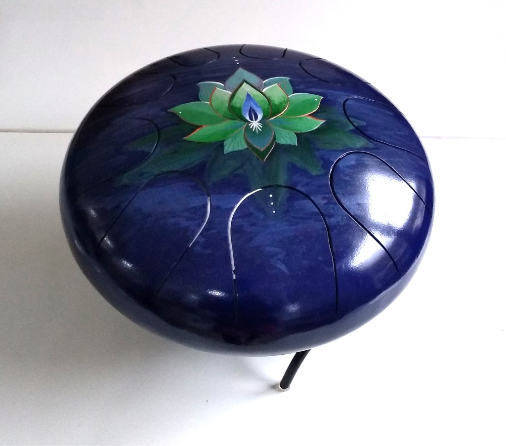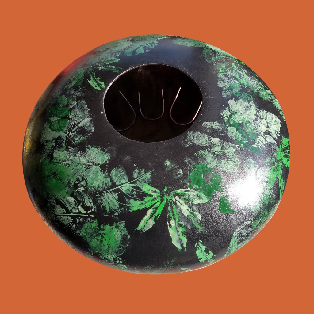 Instruments de musique intuitifs et médidatifs, fabriqués à partir de bouteille de gaz, différentes gammes, gravés ou peints. (30 cm de diamètre pour environ 15 cm de hauteur.)