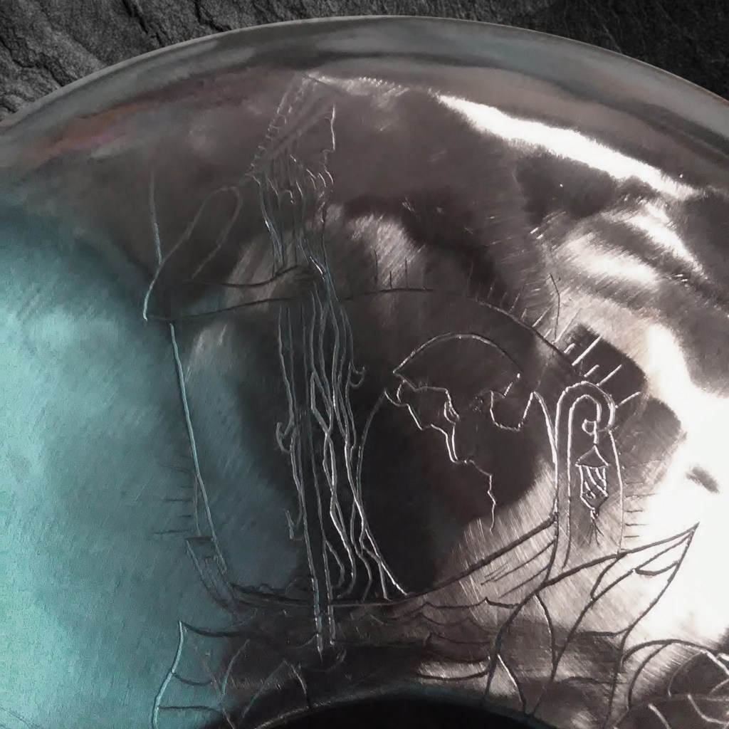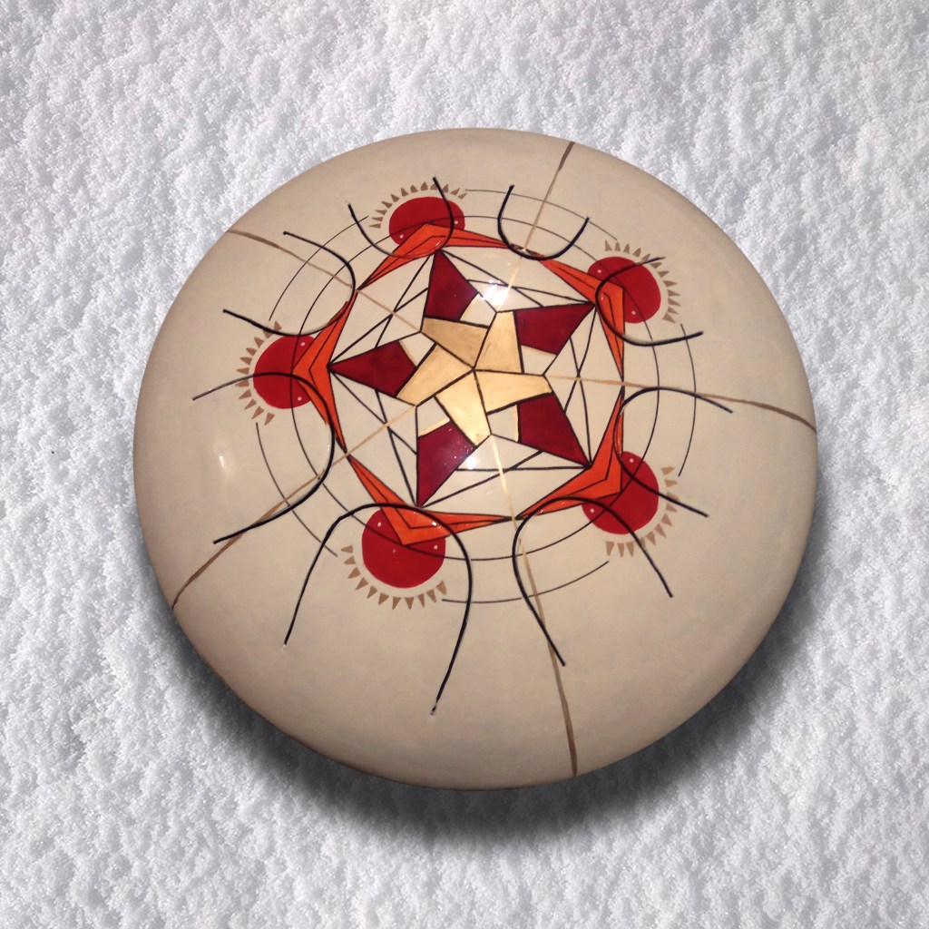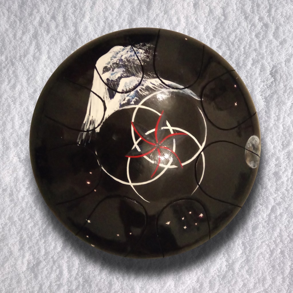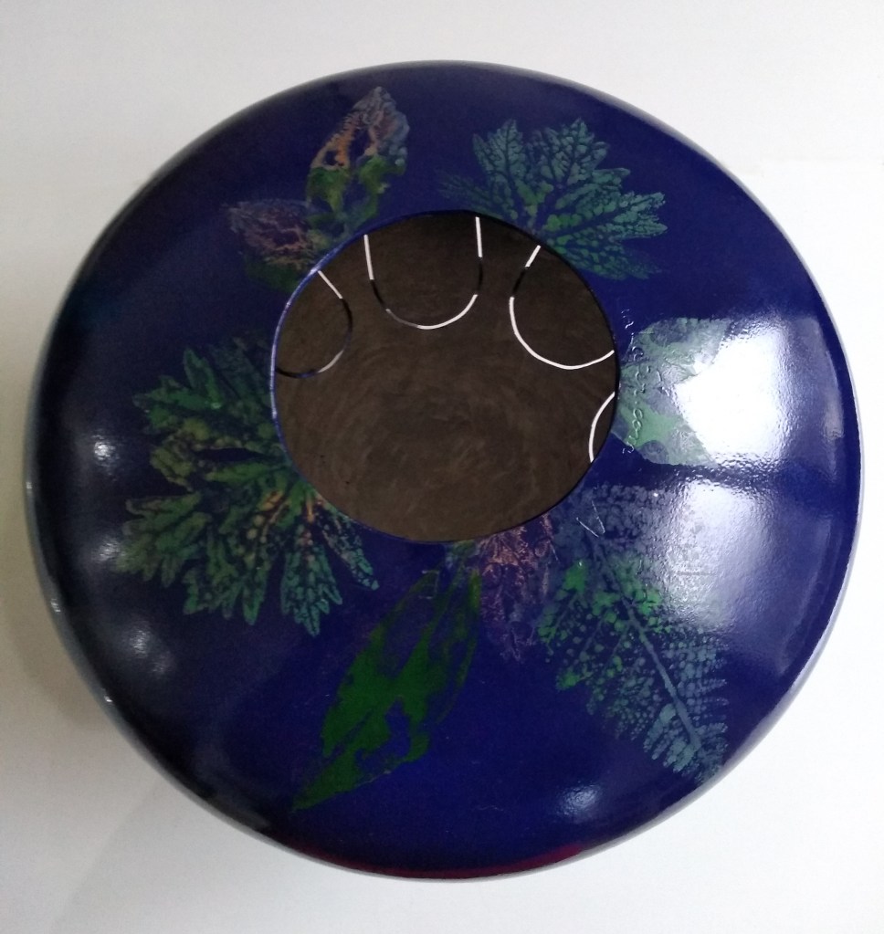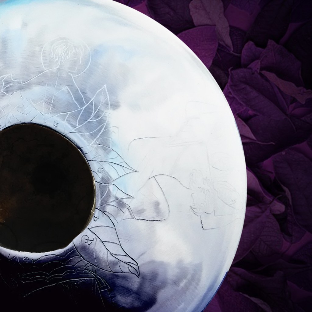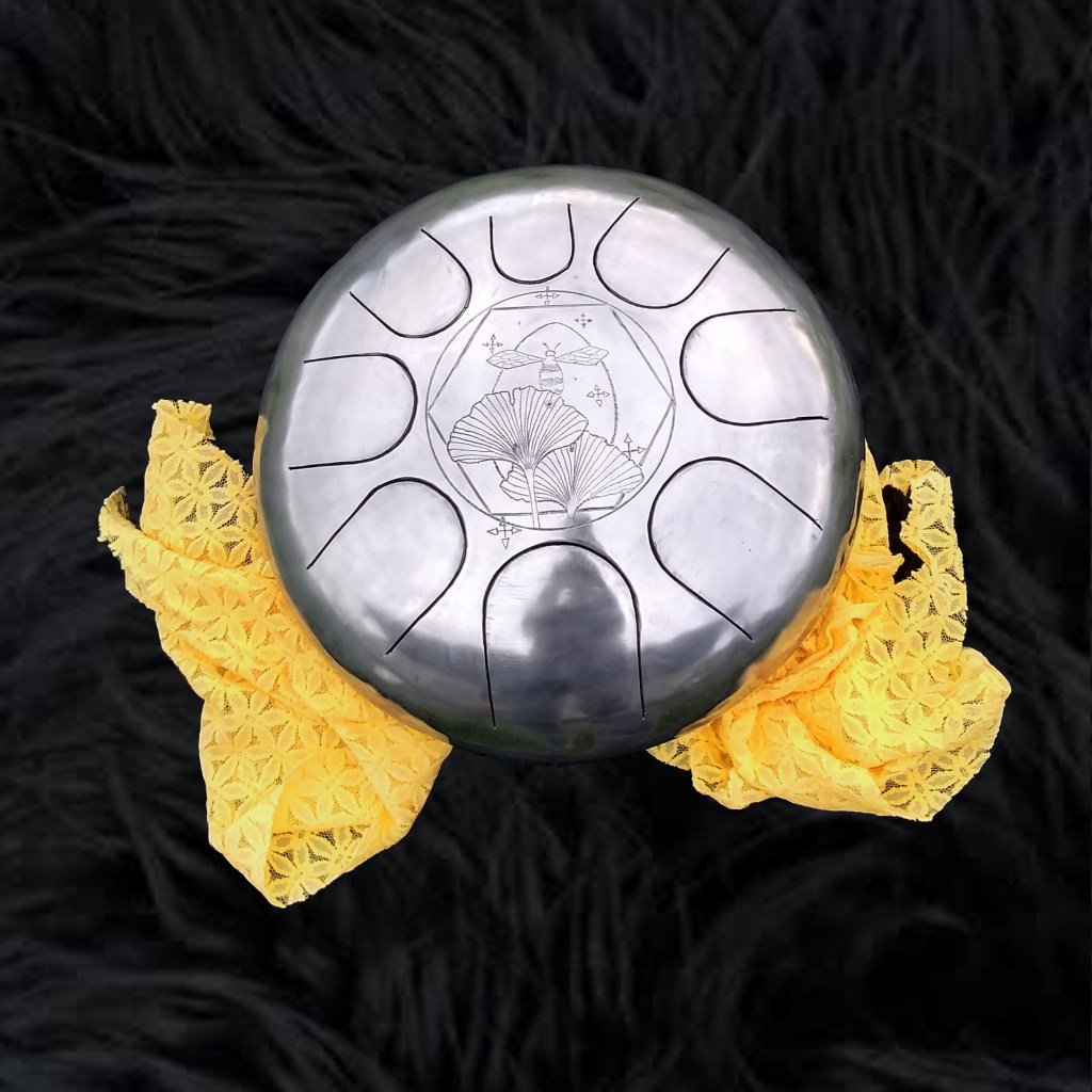 Instruments de musique intuitifs et médidatifs, fabriqués à partir de bouteille de gaz, différentes gammes, gravés ou peints. (30 cm de diamètre pour environ 15 cm de hauteur.)